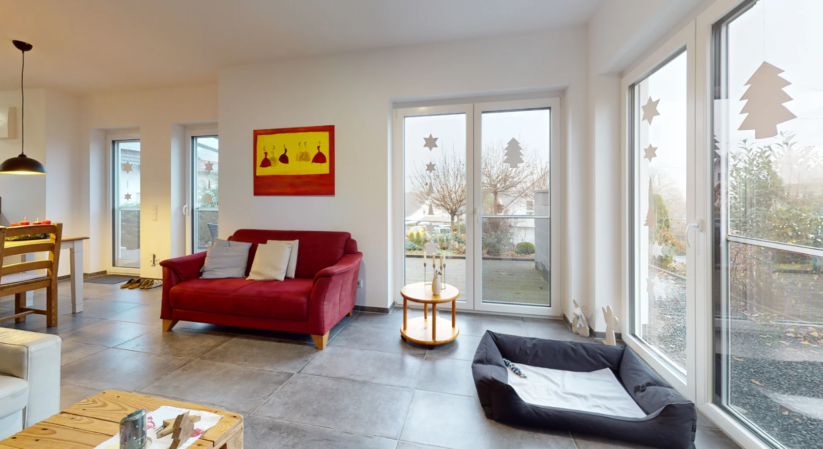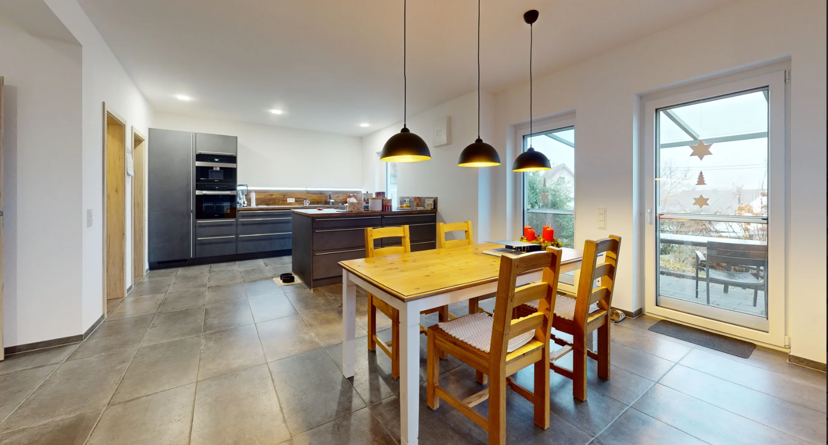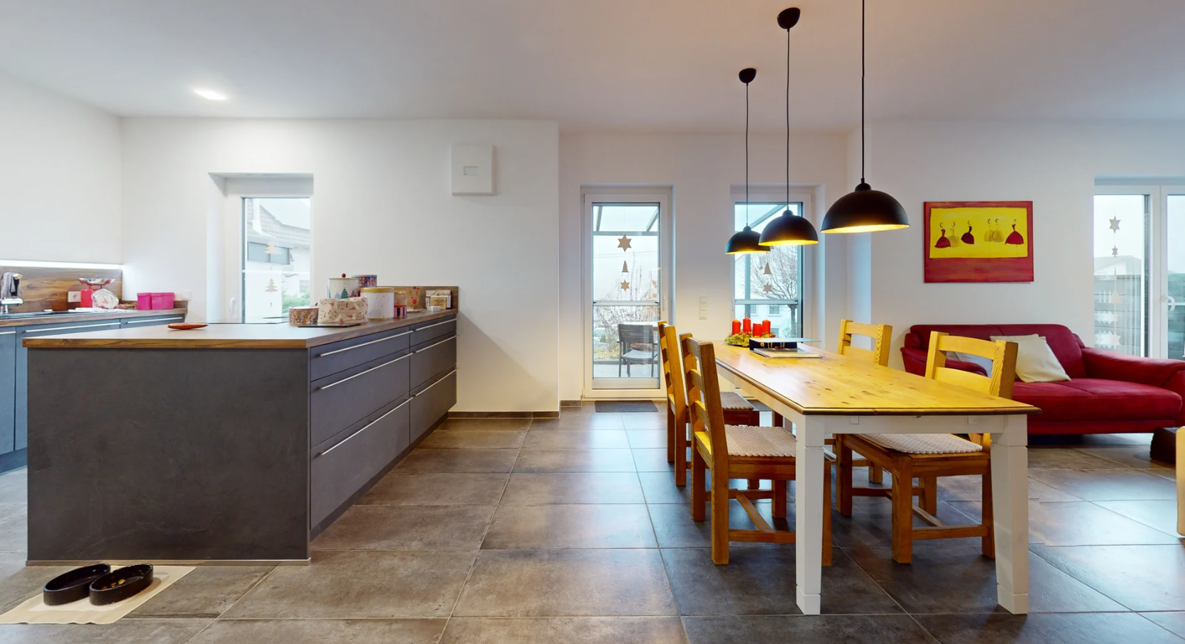 Der Mittelpunkt des Hauses ist der großzügige Wohn- und Essbereich, dessen großformatige Fliesen eine moderne, gleichzeitig warme Atmosphäre schaffen. Die breiten Fensterflächen holen das Tageslicht tief in den Raum und öffnen den Blick ins Grüne – Wohnen fühlt sich hier sofort leichter, freier und harmonischer an.
